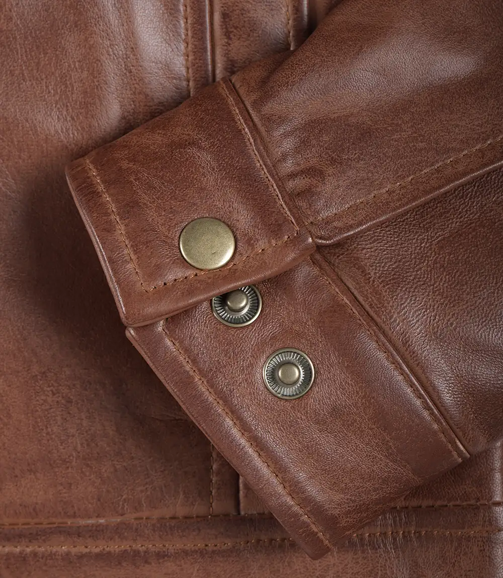 Crafted from 100% real leather, this brown jacket boasts two side pockets, two inside pockets, and an extra pocket for mobile devices of all sizes. With adjustable cuff snap tabs, it ensures a perfect fit.