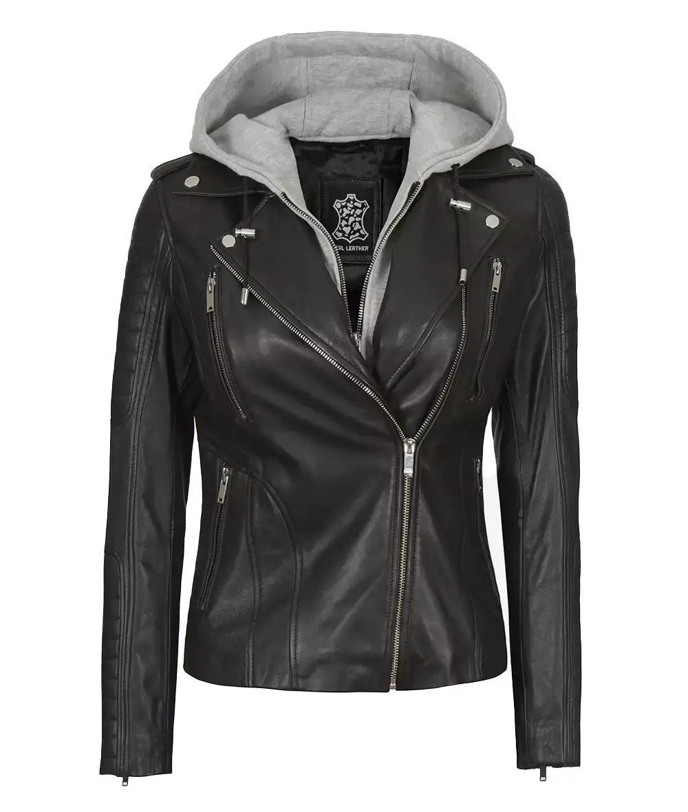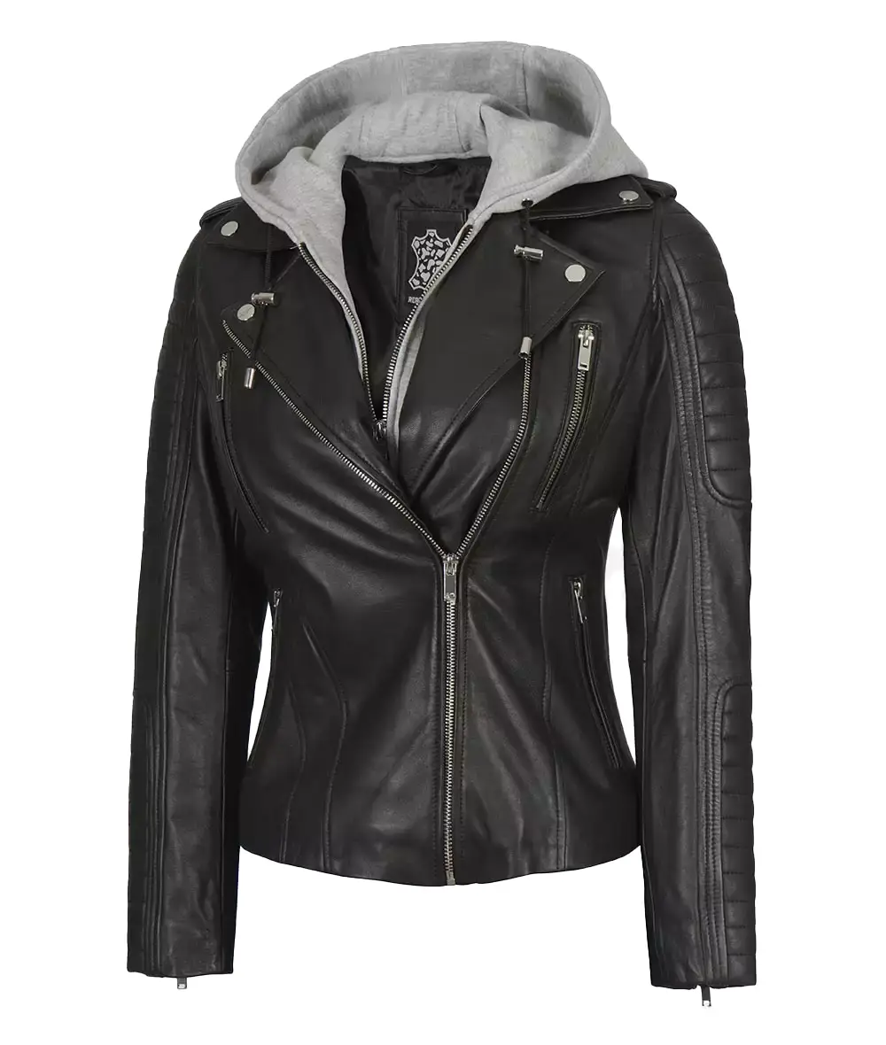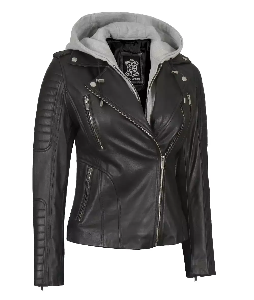 The women’s asymmetrical hooded leather jacket offers versatility in a single package. Key features include premium lambskin leather construction, an asymmetrical zip closure, quilted shoulder panels, and stylish studs.